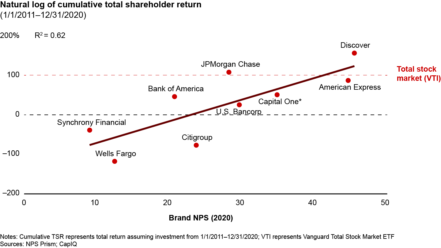 Discover’s approach succeeds not only with retail customers but also with its business clients. Its small and medium size business offerings, for example, have among the highest relationship Net Promoter Score® (NPS) of its peer group, according to NPS Prism® data. And what’s good for customers and employees is good for investors too. From 2011 through 2020, Discover generated the highest total shareholder return in its industry—85 percent greater than the Vanguard Total Stock Market Index Fund.