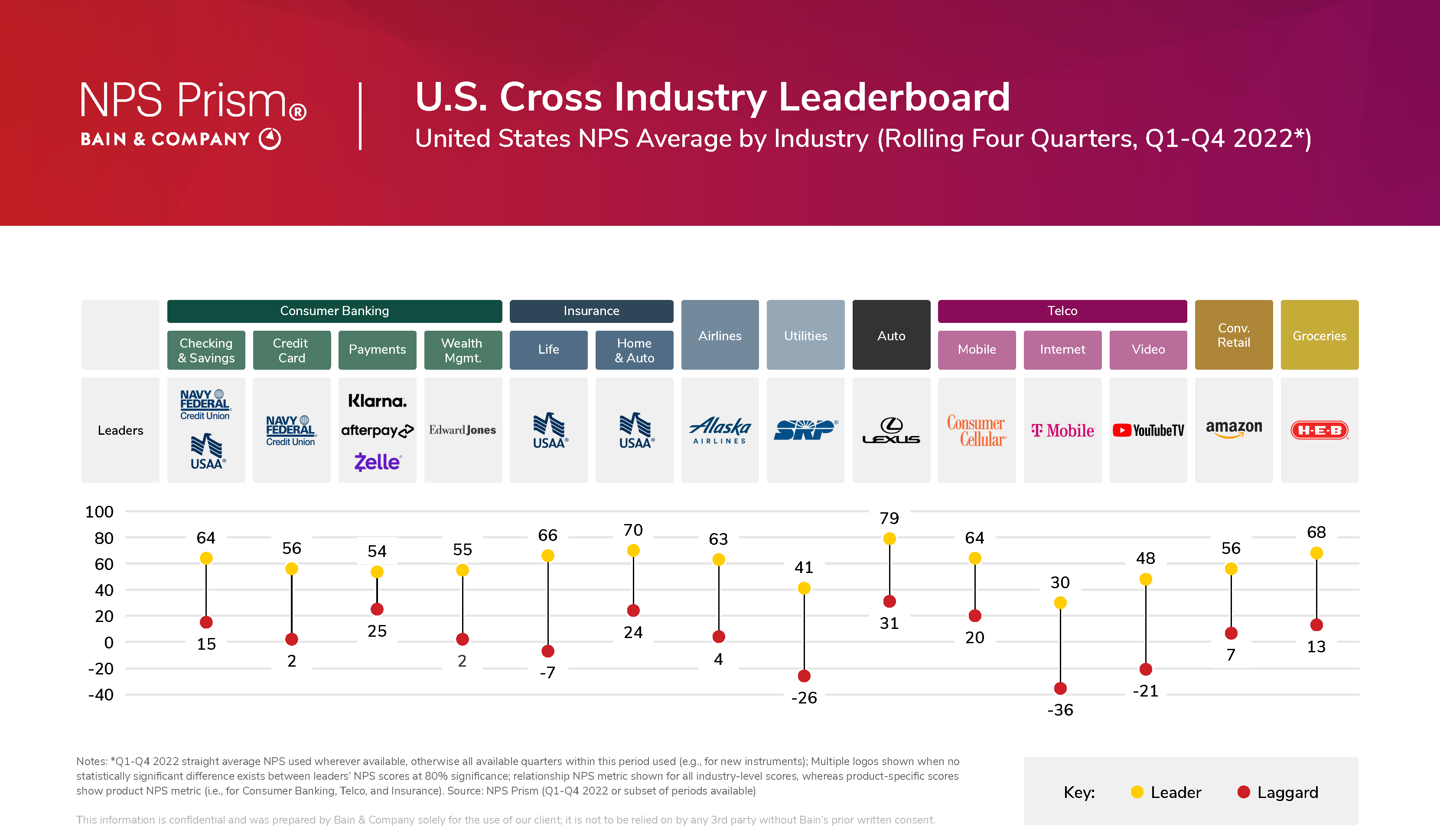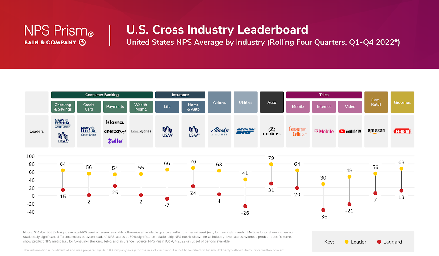 The range of scores within each industry is remarkable—for example, USAA leads life insurance with a score of 66, while the least customer-centric of its competitors polls at minus 7! In four industries—utilities, life insurance, Internet, and video providers—laggards earn negative Net Promoter Scores.